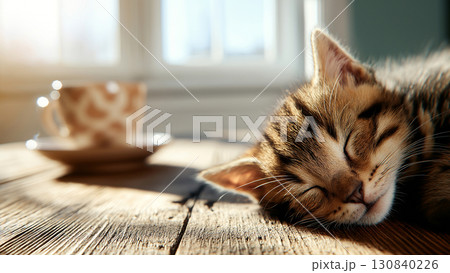 番茄工作法學習時間,舒緩的陽光和咖啡杯,以及一隻橙色的貓在木製咖啡桌上舒適地睡覺