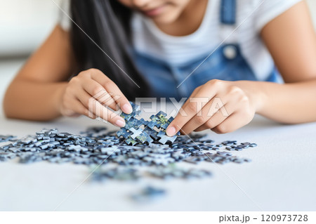 Young Girl Engaging in a Puzzle Activity, Connecting Jigsaw Pieces Together on a Bright Surface, Emphasizing Focus and Enjoyment in a Relaxing Setting