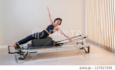 Sporty girl pumps up her arm muscles on a special exercise machine in gym