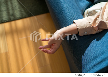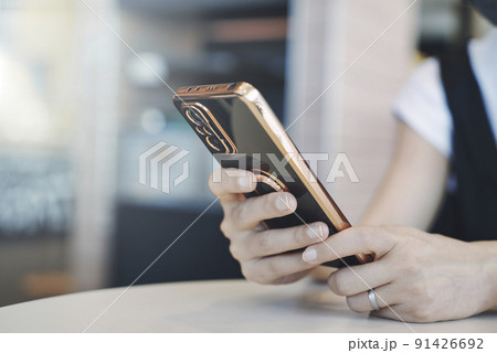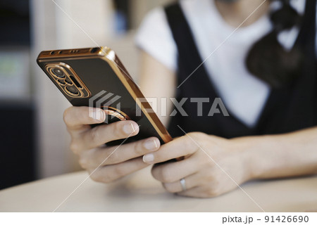 拿著智慧型手機的婦女的手