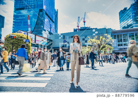 Shibuya Scramble Intersection操作智能手機的女性