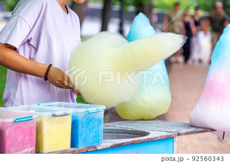 Cones of colorful cotton candy in a summer park on a blurred background.