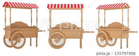 Wooden street vendor cart with striped canopy set. 3D rendering