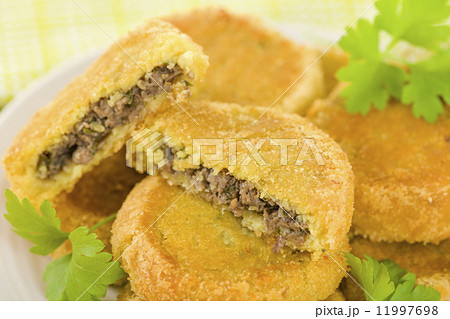 Batata Chap - Middle Eastern potato croquette filled with lamb. Arab traditional street food.