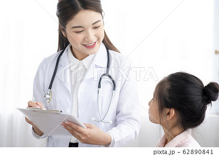 A photo of an Asian pediatrician preparing to do an examination for a kid in clinic.