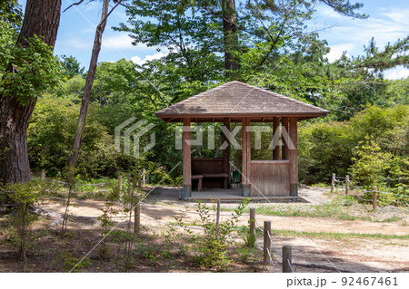 站在公園裡的日式休息小屋