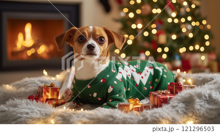 一隻小狗穿著聖誕圖案的衣服和一個溫暖的房間。