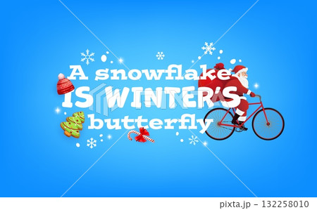 A snowflake is winters butterfly quote Merry Christmas greeting card. Vector Santa on bicycle carry presents in red sack. Knitted hat, gingerbread cookie and candy cane with bow on blue holiday poster