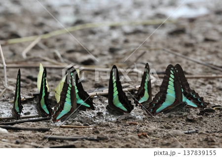 生物,昆蟲:一群僧帽水母在飲水。拍攝於石垣島雨後的一條農場道路上。