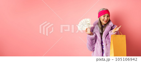 Rich and stylish grandmother going on shopping with dollars, holding paper bag and smiling carefree, standing over pink backgrund