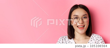 Beauty and lifestyle concept. Close-up of cute asian female model wearing trendy glasses, smiling happy at camera, standing on pink background
