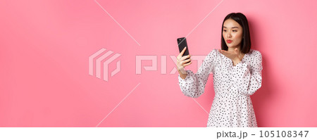 Beautiful asian girl using photo filters app and taking selfie on smartphone, posing in cute dress against pink background