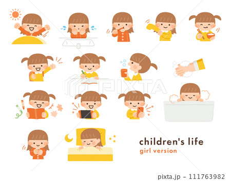 一組兒童日常生活習慣的插畫:起床、刷牙、上幼稚園、吃飯、洗澡、睡覺