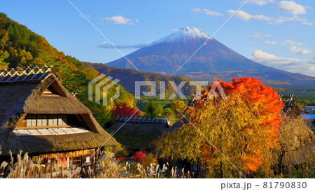 秋天的西湖療愈村 茅草屋頂和半鐘富士山的初雪