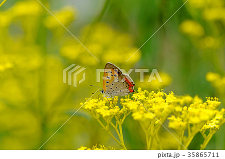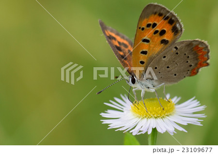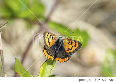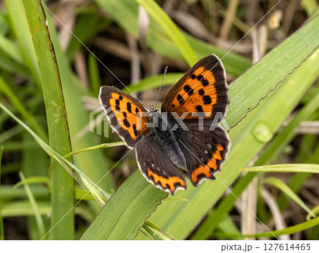 一隻紅銅蝴蝶停在田野裡的一片葉子上