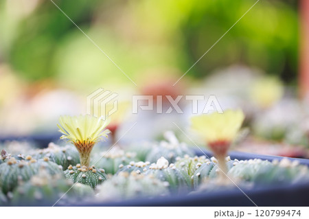 Cacti with yellow flowers in garden setting, showcasing vibrant blooms