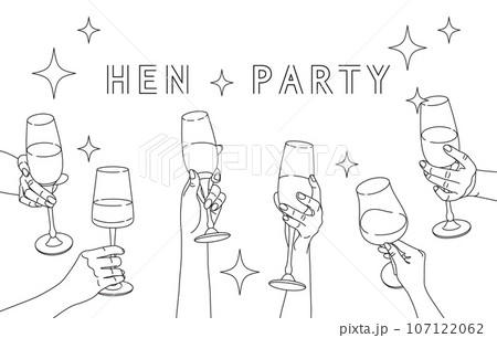 Wedding party champagne doodle, bar alcohol cocktail hand drawn line illustration, female hand glass
