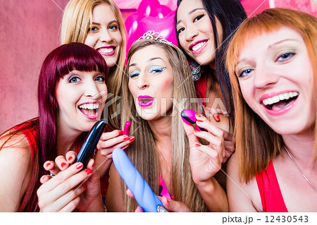 Girls Night Out set. Female friends going out together to celebrate with selfies, cocktails, and karaoke. Bachelorette, night club party with DJ. Flat vector illustration