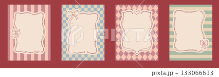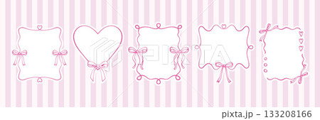 Set of frames with pink ribbon and bows. Hand-drawn coquette borders. Elegant and romantic design elements for cards, wedding invitations. Vector doodle illustration on a stripped pink background.