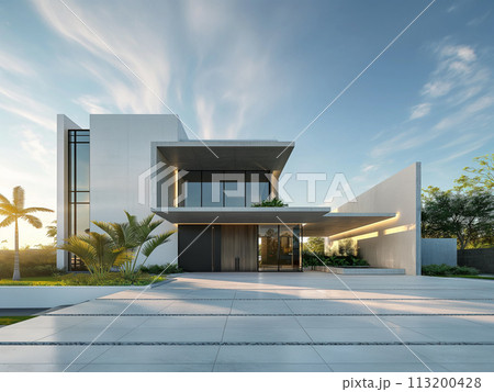 現代簡單的房屋建築,無人居住的磚地,晴朗的天空背景。