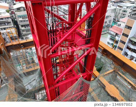 極簡主義背景,紅色屋頂映襯著藍天白雲。