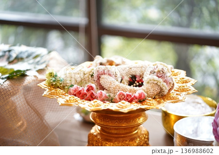 Portrait of jasmine and rose garland top golden tray. Jasmine garland is a handicraft that often used for events.