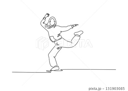 Single continuous line drawing female dancer mid-step, balancing on one foot with the other leg kicked back and arms raised, high-energy Hip Hop pose. One line draw graphic design vector illustration