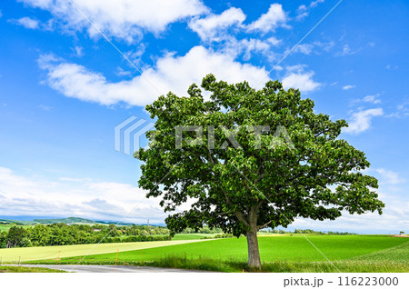 北海道,夏日清爽的藍天和清新的綠草地風景