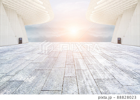 無人磚地路面與山脈天際線