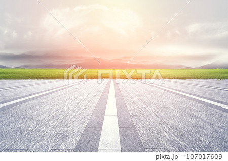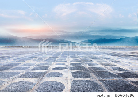 無人磚地廣場平台與草地有山脈自然景觀背景