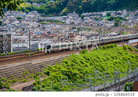 東海道本線上山科站和京都站之間的特快列車。從山科站瞭望台看到的景色。