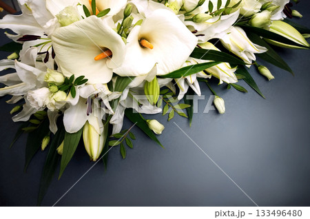 White delicate calla lily flowers composition, condolence flower background card, funeral concept image, selective focus, shallow DOF