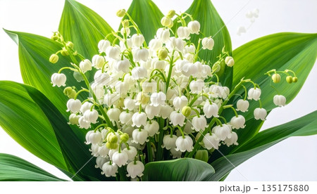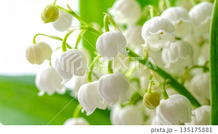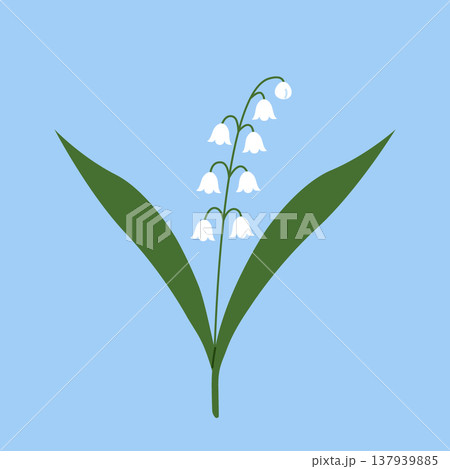 White lily of the valley flowers blooming beautiful on a stem with green leaves. Springtime blossom symbol for nature and seasonal growth.