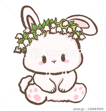 Cute bunny wearing lily of the valley flower crown hand drawn kawaii spring rabbit illustration for nursery decor greeting cards and floral themed designs