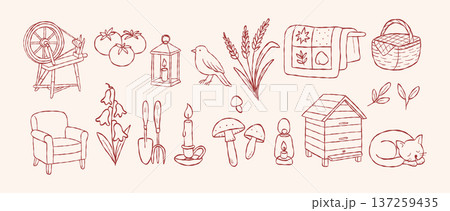 Vintage cottagecore vector set with spinning wheel beehive sleeping cat and handcrafted elements in hand drawn doodle line art style for rustic heritage design