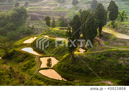 初夏Yamakoshi的梯田和露台池塘