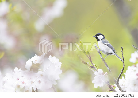 一隻大山雀棲息在櫻花枝上 — 水彩插圖