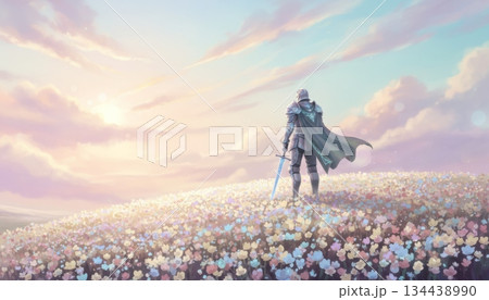 Knight Facing Away on Hill with Pale Flower Meadow, Pastel Sky, Soft Light