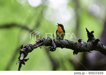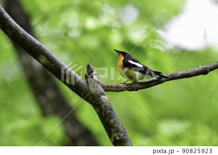 一種美麗的小鳥,水仙捕蠅器,在初夏時在輕井澤等高原森林中發現了亮黃色和橙黑色。