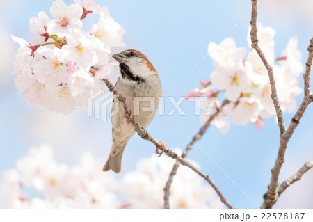 盛開的櫻花和野鳥、麻雀、春天的材料