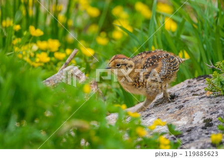 初夏生活在北阿爾卑斯山室堂平的松雞雛鳥