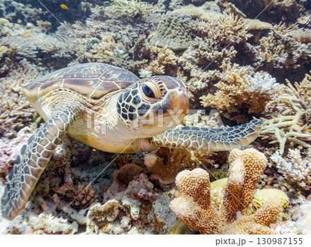 一隻綠海龜頭上長著一隻海蛞蝓。還有潛水員。美麗的珊瑚礁和成群的熱帶魚。沖繩縣島尻郡
