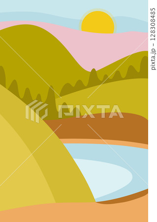 Abstract minimalistic poster. Spring, pink sunrise, sun, mountains, forest and river. Vector illustration for printing on paper, fabric.