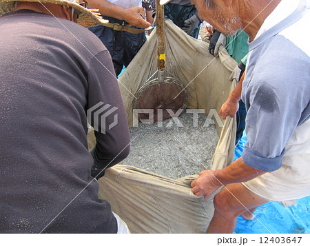 圖為漁夫在船上撒網。漁民在魚市做準備。
