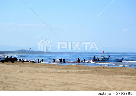 二宮町袖浦海岸:延伸至海平線的圍網捕魚繩索