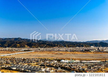 從靜岡縣島田市牧之原公園看到的富士山,島田市區的大井川在下方展開。
