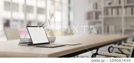A laptop computer with a white screen mockup on a meeting table in a modern meeting room.