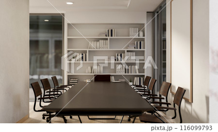 The interior design of a contemporary meeting room features a meeting table and a large bookshelf.