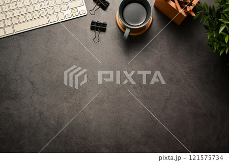 Stylish workspace with a cup of coffee and keyboard on dark grey stone background