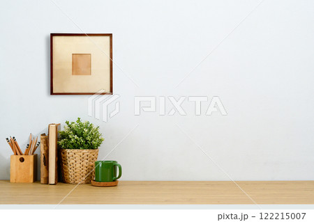 Simple desk arrangement with pencil holder, vintage books, potted plant, coffee mug, and picture picture frame on the wall